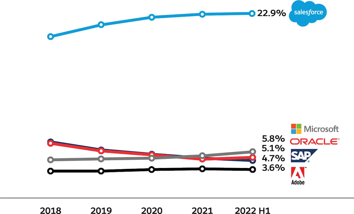 Salesforce continues to lead in CRM. Data shows Salesforce with leading market share in IDC’s segments for sales applications, customer service applications, marketing applications, model-driven application platforms, and enterprise community applications